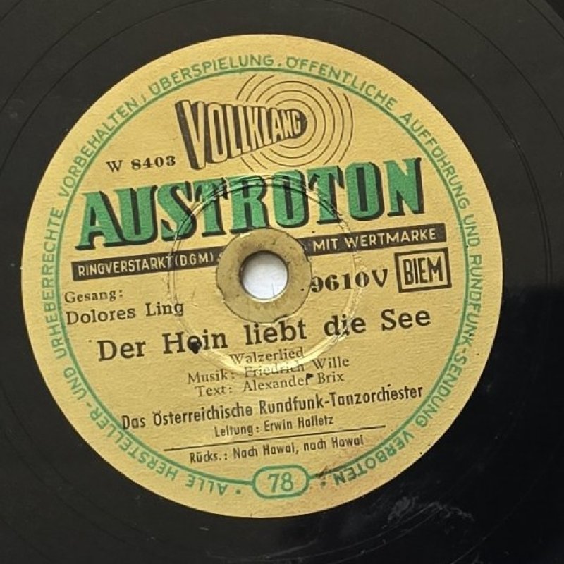 Hinweis: Diese historische Schellackplatte von Dolores Ling präsentiert traditionelle Walzerlieder mit dem Österreichischen Rundfunk-Tanzorchester. Genießen Sie die melodischen Klänge von 'Der Hein liebt die See' und 'Nach Hawai, nach Hawai', dirigiert von Erwin Holletz.