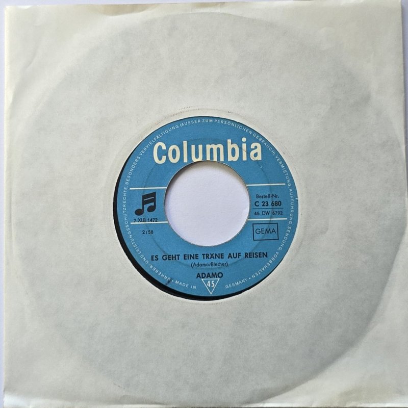 Inventarnummer: PL45-001891 Format: single RPM: 45 Interpret: Adamo Titel Seite A: Es geht eine Träne auf Reisen Titel Seite B: Mit dir beginnt mein Leben Label: Columbia Katalognummer: C 23 680 Matrize A: XLB 1472 Matrize B: XLB 1473 Zustand Platte: VG- Zustand Cover: VG+ Jahr: - Herkunftsland der Pressung: Deutschland Genre: Schlager Hinweis: Diese Single von Adamo enthält die Hits "Es geht eine Träne auf Reisen" und "Mit dir beginnt mein Leben". Pressung aus Deutschland auf dem Columbia-Label, ein schönes Beispiel klassischer 1960er-Schlager. Die Scheiben sind sauber erhalten und gut spielbar. Materialtyp: vinyl Jahrzehnt: 1960er Gewicht in g: 40 g Zustandsnotiz: - Differenzbesteuerung nach §25a UStG