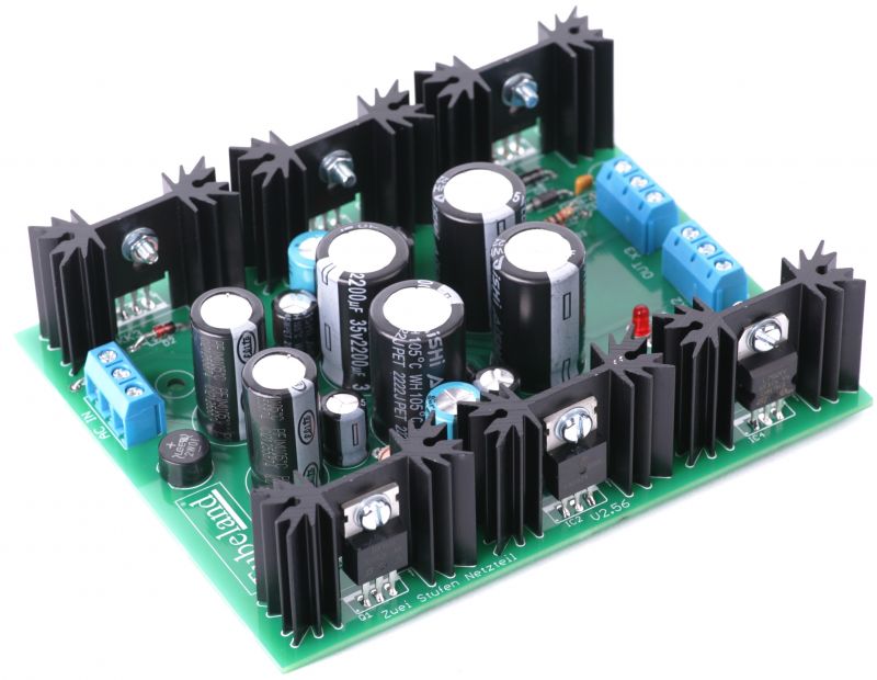 Die Idee, Netzteile dieser Art einzusetzen, ist altbewährt. In der Vergangenheit traten Kunden mit der Nachfrage danach auch an mich heran. Dieses Modell wurde entwickelt um RIAA Entzerrer auch in einen Vollverstärker einbauen zu können. Das Netzteil liefert zwei Symmetrische Ausgangsspannungen die nach Wunsch durch Festspannungsregler Frei gewählt werden können. Je nach Anwendung. Die leiterplatte habe ich für meine Vollverstärker entwickelt wie z.b. den KT170 SE. Die Versorgungsspannung ist abhängig von der Nutzspannung und von den Nutzstrom. So wie ich ihn hier für meine Zwecke einsetze betreibe ich ihn mit 2x24V AC was sich in der Praxis für den KT170 SE als ausreichend gezeigt hat.