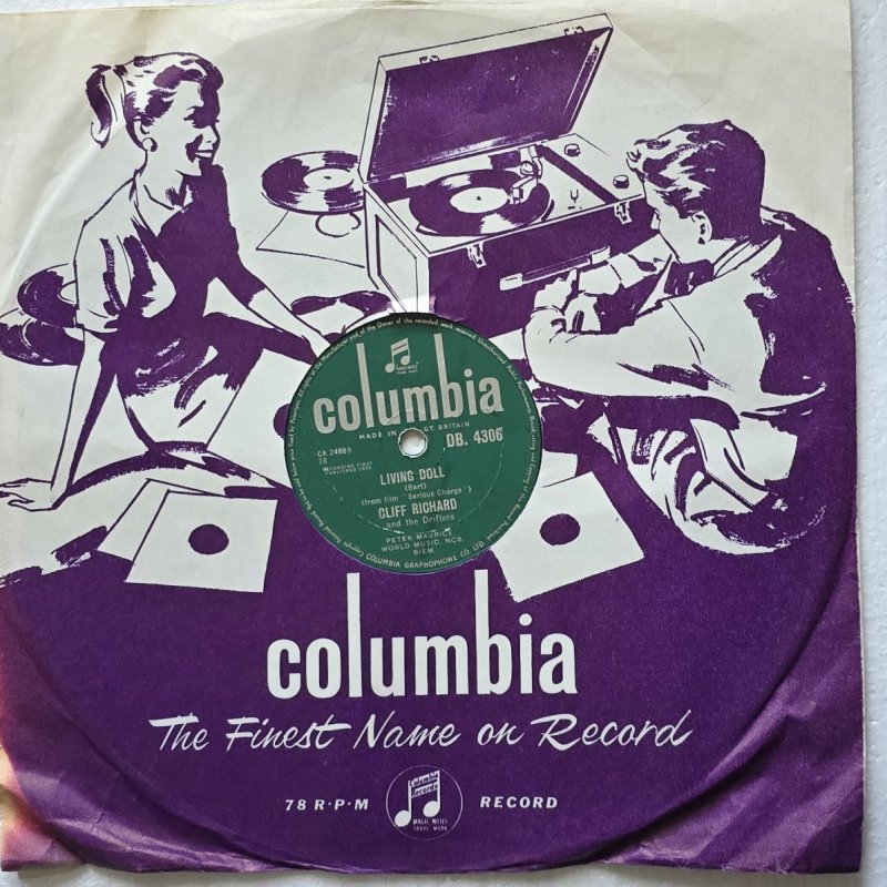 Inventarnummer: PL78-000083 Format: schellack RPM: 78 Interpret: Cliff Richard and the Drifters Titel Seite A: Living Doll Titel Seite B: Apron Strings Label: Columbia Katalognummer: DB. 4306 Matrize A: CA 24889 Matrize B: CA 24877 Zustand Platte: G Zustand Cover: VG Jahr: 1959 Herkunftsland der Pressung: Großbritannien Genre: Pop Hinweis: Diese Single von Cliff Richard and the Drifters beinhaltet die Hits 'Living Doll' und 'Apron Strings'. Eine klassische Pop-Veröffentlichung aus den späten 1950er Jahren, perfekt für Sammler. Die Schallplatte ist im Originalpapiercover mit typischem Columbia-Design erhalten. Materialtyp: shellac Jahrzehnt: 1950er Gewicht in g: 200 g Zustandsnotiz: Living Doll zimlich Abgespielt B Seite aber gut hörbar Differenzbesteuerung nach §25a UStG
