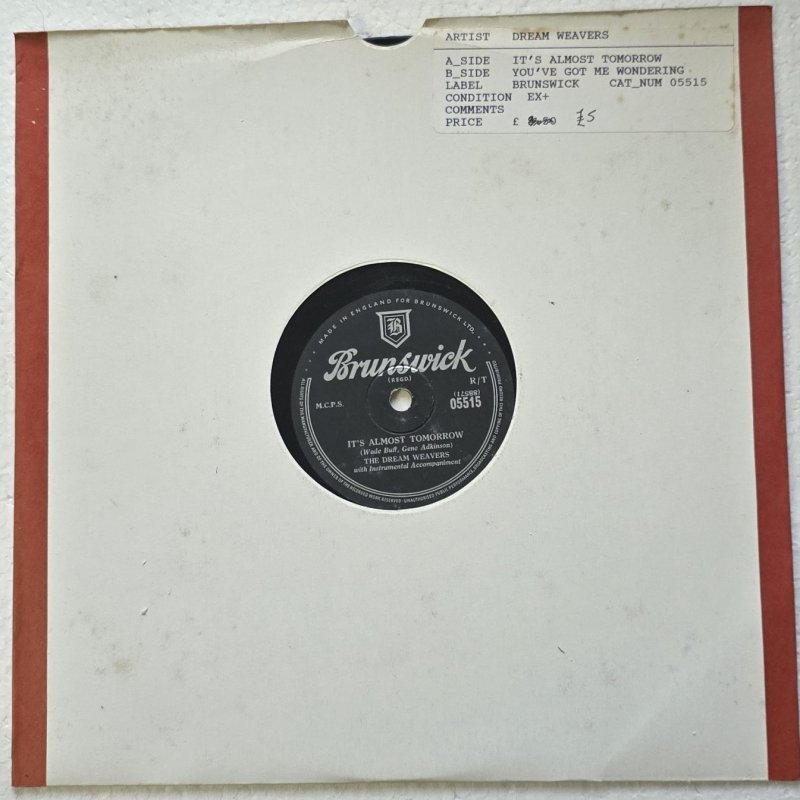 Inventarnummer: PL78-000153 Format: schellack RPM: 78 Interpret: The Dream Weavers Titel Seite A: It's Almost Tomorrow Titel Seite B: You've Got Me Wondering Label: Brunswick Katalognummer: 05515 Matrize A: 88571 Matrize B: 88572 Zustand Platte: VG Zustand Cover: VG Jahr: 1955 Herkunftsland der Pressung: England Genre: Pop Hinweis: Diese britisch hergestellte Brunswick-Single aus den 1950er Jahren bietet zwei charmante Pop-Titel der Dream Weavers. Die Songs "It's Almost Tomorrow" und "You've Got Me Wondering" überzeugen mit klassischem Sound und instrumentaler Begleitung. Eine feine Ergänzung für Sammler und Liebhaber nostalgischer Musik. Materialtyp: shellac Jahrzehnt: 1950er Gewicht in g: 200 g Zustandsnotiz: - Differenzbesteuerung nach §25a UStG