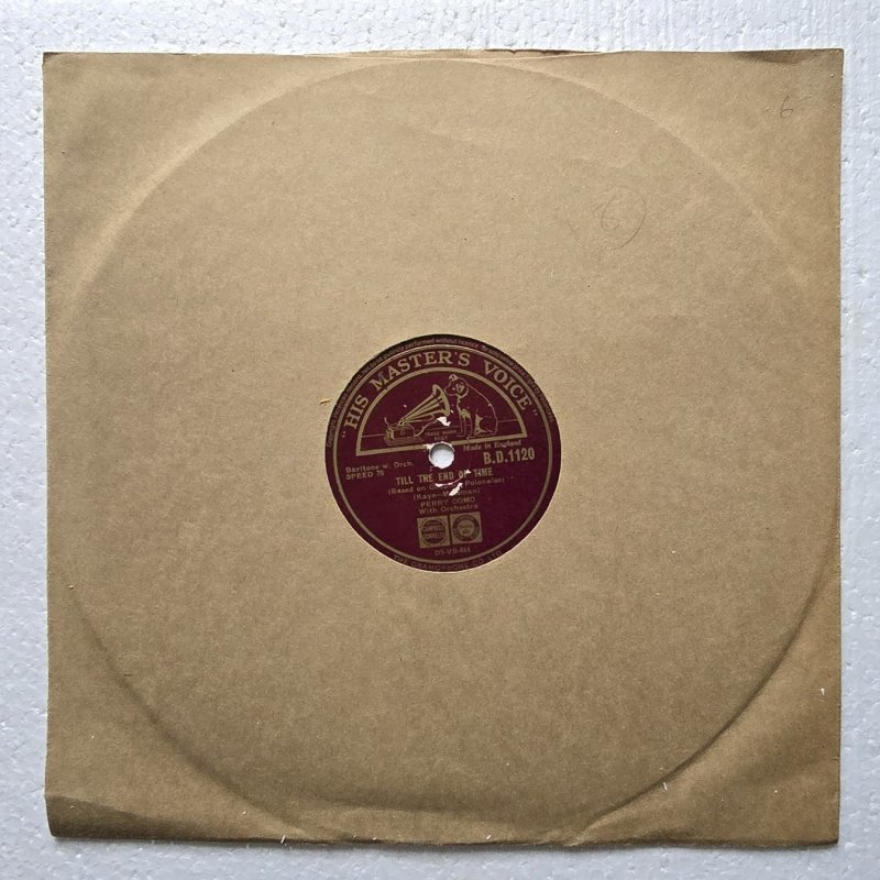 Inventarnummer: PL78-000230 Format: schellack RPM: 78 Interpret: Perry Como Titel Seite A: That Feeling in the Moonlight Titel Seite B: Till The End Of Time Label: His Master's Voice Katalognummer: B.D. 1120 Matrize A: - Matrize B: D5-VB-464 Zustand Platte: VG Zustand Cover: VG Jahr: 1946 Herkunftsland der Pressung: England Genre: Pop Hinweis: Diese englische 78er Schellackplatte von His Master's Voice zeigt zwei Titel von Perry Como mit Orchesterbegleitung. Ein schönes Beispiel aus den 1940er Jahren mit dem Hit "Till The End Of Time". Die Platte wird im Original-Papierschutz ohne Außencover geliefert. Materialtyp: shellac Jahrzehnt: 1940er Gewicht in g: 200 g Zustandsnotiz: - Differenzbesteuerung nach §25a UStG