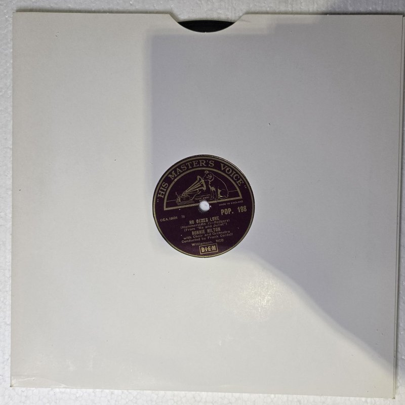 Inventarnummer: PL78-000250 Format: schellack RPM: 78 Interpret: Ronnie Hilton & Alma Titel Seite A: It's All Been Done Before Titel Seite B: No Other Love Label: His Master's Voice Katalognummer: POP. 198 Matrize A: OEA.18573 Matrize B: OEA.18604 Zustand Platte: VG- Zustand Cover: VG Jahr: 1956 Herkunftsland der Pressung: England Genre: Pop Hinweis: Diese Single von Ronnie Hilton & Alma enthält die charmanten Pop-Titel "It's All Been Done Before" und "No Other Love", dirigiert von Frank Cordell. Eine interessante Sammlerplatte des britischen Labels His Master's Voice aus den 1950er Jahren. Materialtyp: shellac Jahrzehnt: 1950er Gewicht in g: 200 g Zustandsnotiz: - Differenzbesteuerung nach §25a UStG