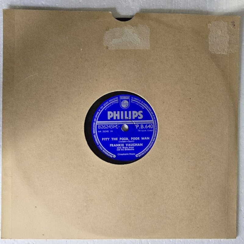 Inventarnummer: PL78-000281 Format: schellack RPM: 78 Interpret: Frankie Vaughan Titel Seite A: The Green Door Titel Seite B: Pity The Poor, Poor Man Label: Philips Katalognummer: P.B.640 Matrize A: AA 26245 2H Matrize B: AA 26245 1H Zustand Platte: VG Zustand Cover: G Jahr: 1956 Herkunftsland der Pressung: England Genre: Pop Hinweis: Diese seltene 78er Single von Frankie Vaughan mit den Titeln 'The Green Door' und 'Pity The Poor, Poor Man' präsentiert klassischen Pop-Sound der 1950er Jahre. Gepresst von Philips in England, ist diese Platte ein interessantes Sammlerstück für Liebhaber dieser Ära. Materialtyp: shellac Jahrzehnt: 1950er Gewicht in g: 200 g Zustandsnotiz: - Differenzbesteuerung nach §25a UStG